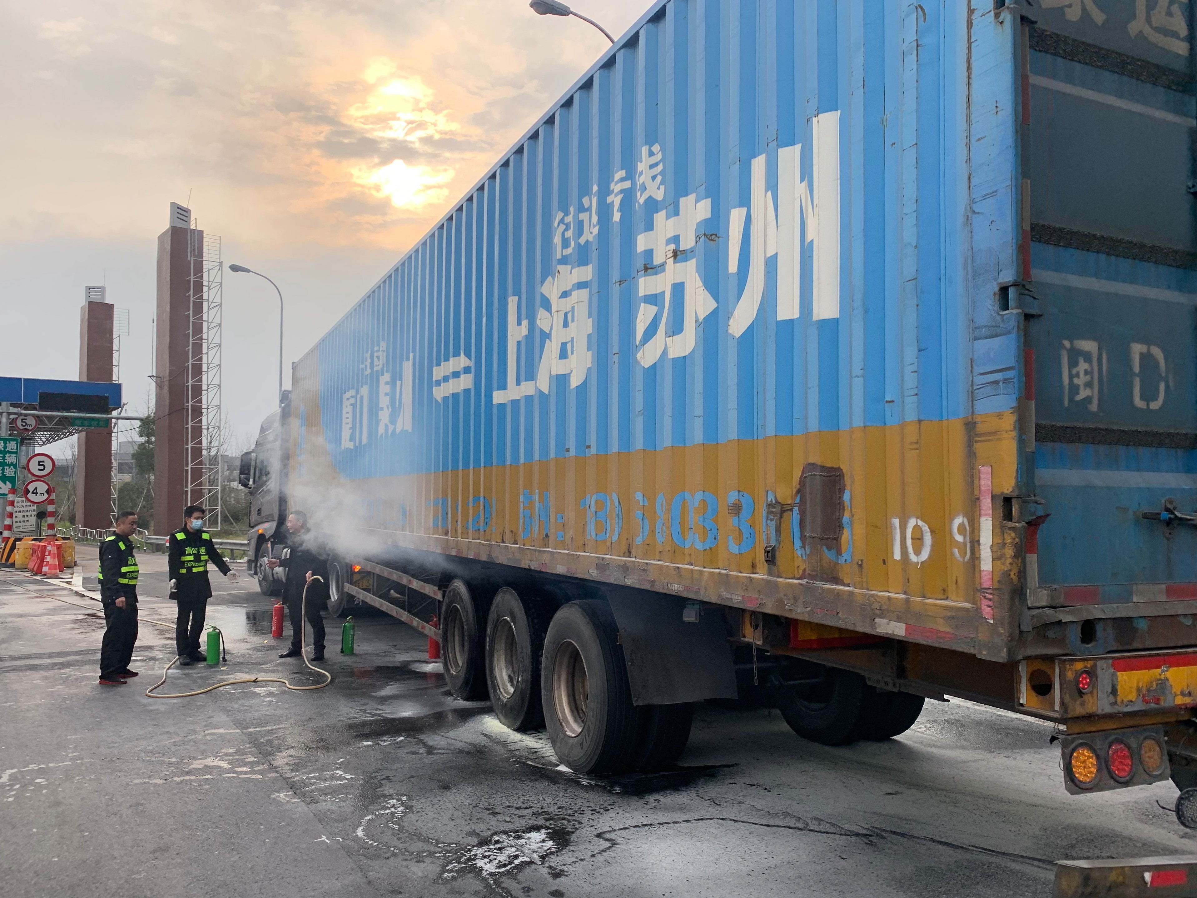 “停車,停車,輪胎起火了。”收費員盧靜對著貨車不停搖手,喊話,貨車駕駛員這才發現情況,在內廣場附近停下來。 時間就是生命,時間就是速度,當班班長張錚,副班長黃智超和收費員鐘鴻廣第一時間拿起崗亭外的滅火器奔向起火車輛。大家齊心協力,火苗瞬間被壓了下去。