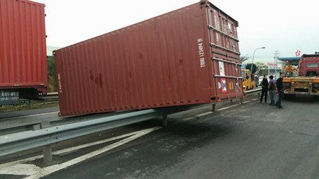 12月15日10:10分左右,一輛車牌為浙B88C06的集裝箱車在臺(tái)州南副站選擇出口車道時(shí),因變道和出口運(yùn)載汽車的長(zhǎng)掛車發(fā)生碰撞,使得未鎖牢的集裝箱箱體甩落下來(lái),砸到護(hù)欄及進(jìn)口一輛正在通行的貨車車頭,造成護(hù)欄變形、貨車車頭受損嚴(yán)重,所幸無(wú)人員受傷。