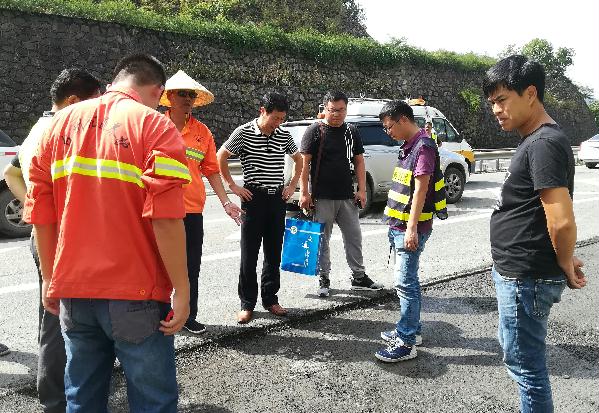 圖為集團總工程師江輝與相關人員在現場協商病害處置方案 根據施工方反應,臨海南匝道段瀝青路面病害較為嚴重,江輝一行即刻邀請路面專項工程設計方共同到現場,仔細檢查瀝青路面病害情況,并根據病害程度,裂縫、車轍等情況協商確定相應的專項處置方案,以便更好地開展路面維修工作。