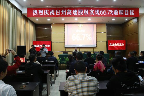 臺(tái)州高速股權(quán)集中和優(yōu)化工作領(lǐng)導(dǎo)小組辦公室主任、臺(tái)州高速集團(tuán)總經(jīng)理張建平鄭重地宣布:“至此,全市共完成臺(tái)州高速股權(quán)轉(zhuǎn)讓6947萬股,臺(tái)州市屬國企及黃巖財(cái)務(wù)開發(fā)公司合計(jì)持股數(shù)1.441億股,完成了66.7%的預(yù)定收購目標(biāo)。”