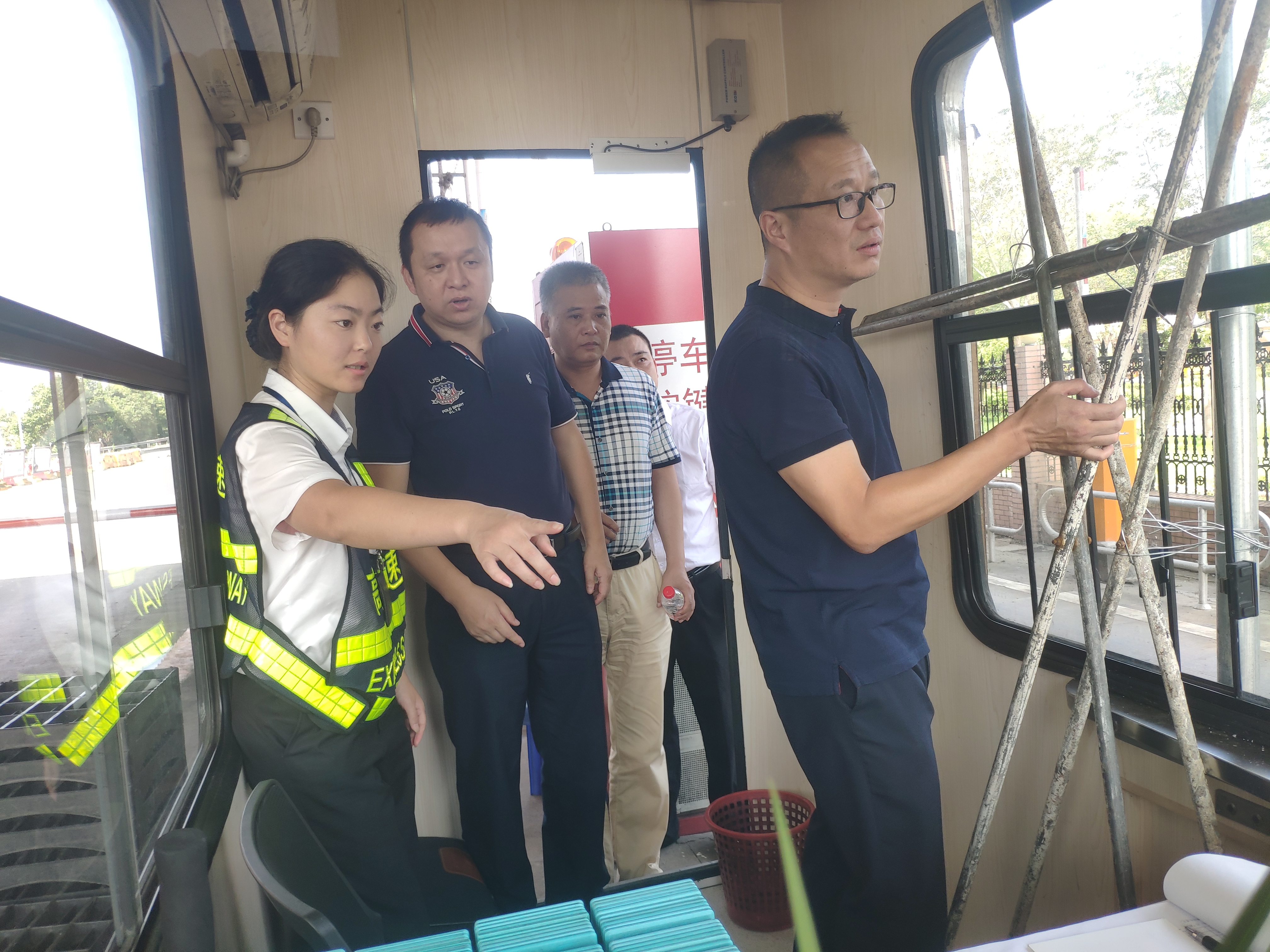 圖為章海峰在臺州收費所檢查收費崗亭 在各所、中心,章海峰關切詢問在崗人員的家里情況,仔細檢查收費站崗亭設備設施等修復運行情況,以及走訪員工宿舍區、辦公樓。他對各所、中心災后及時恢復工作給予贊賞,并充分肯定大家在臺風期間仍堅守崗位,上下一心,加班加點恢復站所的那種不怕苦的精神。