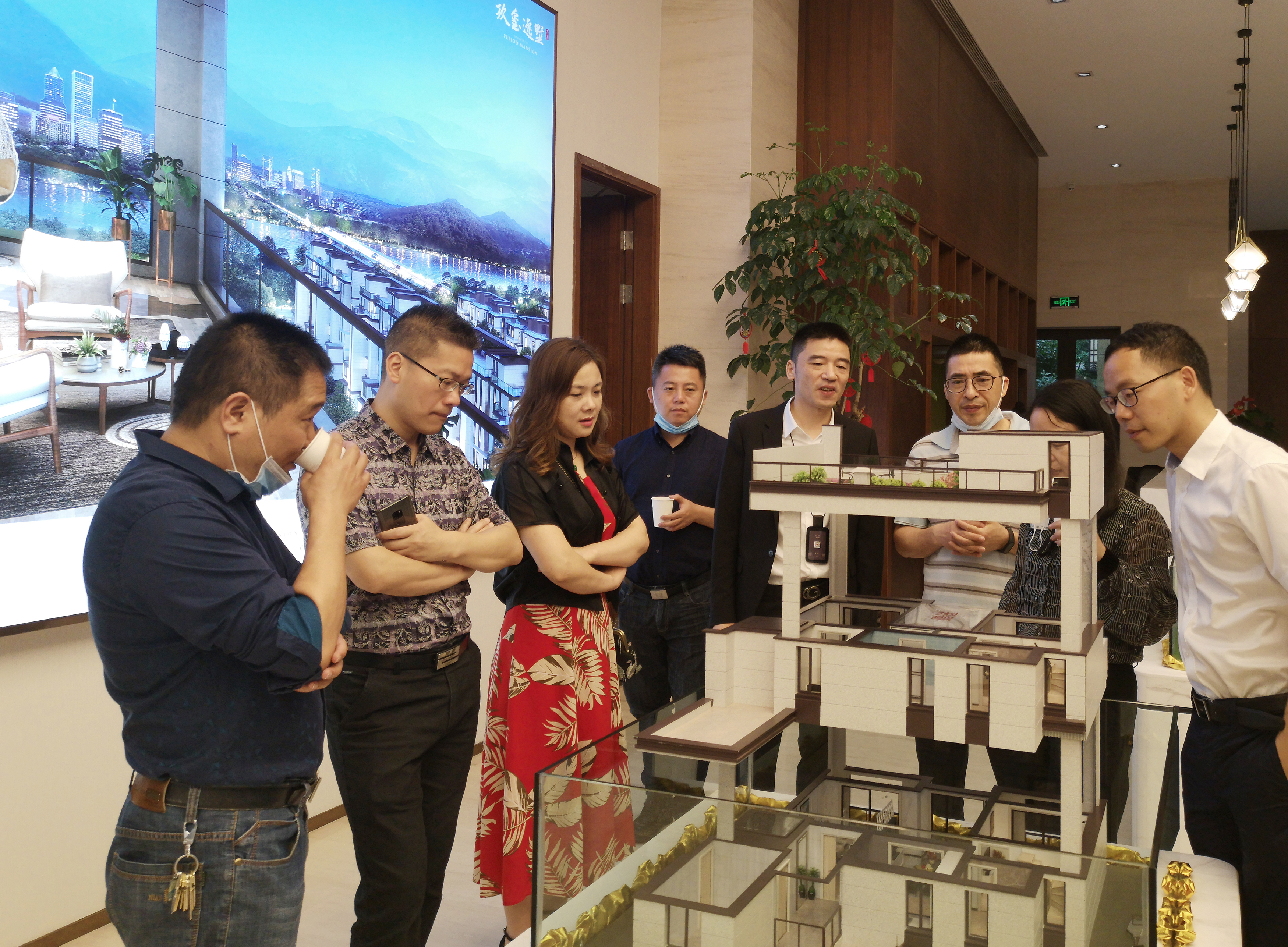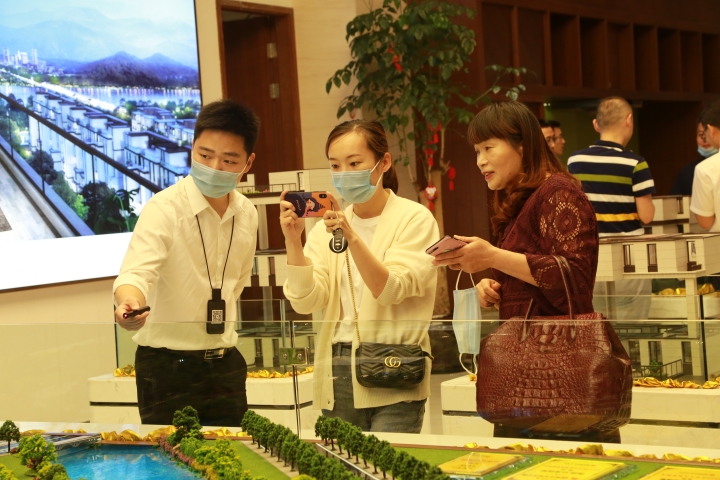 圖為陳文波等領導在沙盤前聽取有關開盤工作匯報
