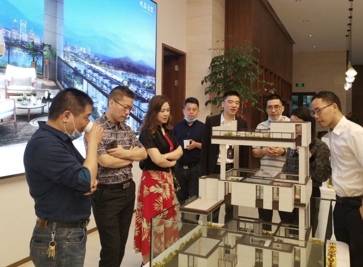 圖為陳文波對照圖紙了解樓盤情況 在銷售展廳樓盤沙盤前,陳文波聽取了高速房產(集團)公司負責人關于玖璽逸墅項目銷售計劃、認籌客戶等情況匯報。他對前期房產公司的辛苦付出給予充分肯定,要求大家認真服務好每一個來訪客戶,彰顯出國企品質,全力做好銷售工作。 當天,銷售展廳樓內,陸陸續續有客戶進出,“我很早就看中這個樓盤了,不僅位置好,而且采光好、通風好,居住在這里一定非常舒服。”一名準客戶張女士夸贊道,今天她特意前來交付認籌金。  圖為客戶在疊墅沙盤前參觀