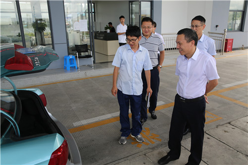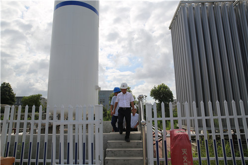 在加氣工藝區,張建平一行帶上頭盔,深入到加氣站的核心區塊了解加氣站的運行狀況,看到嶄新的設備和整潔的環境,張建平頻頻點頭。